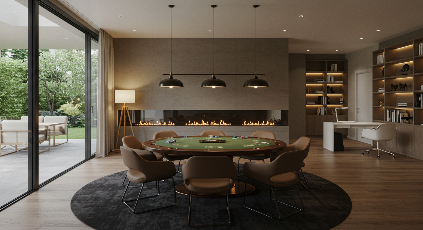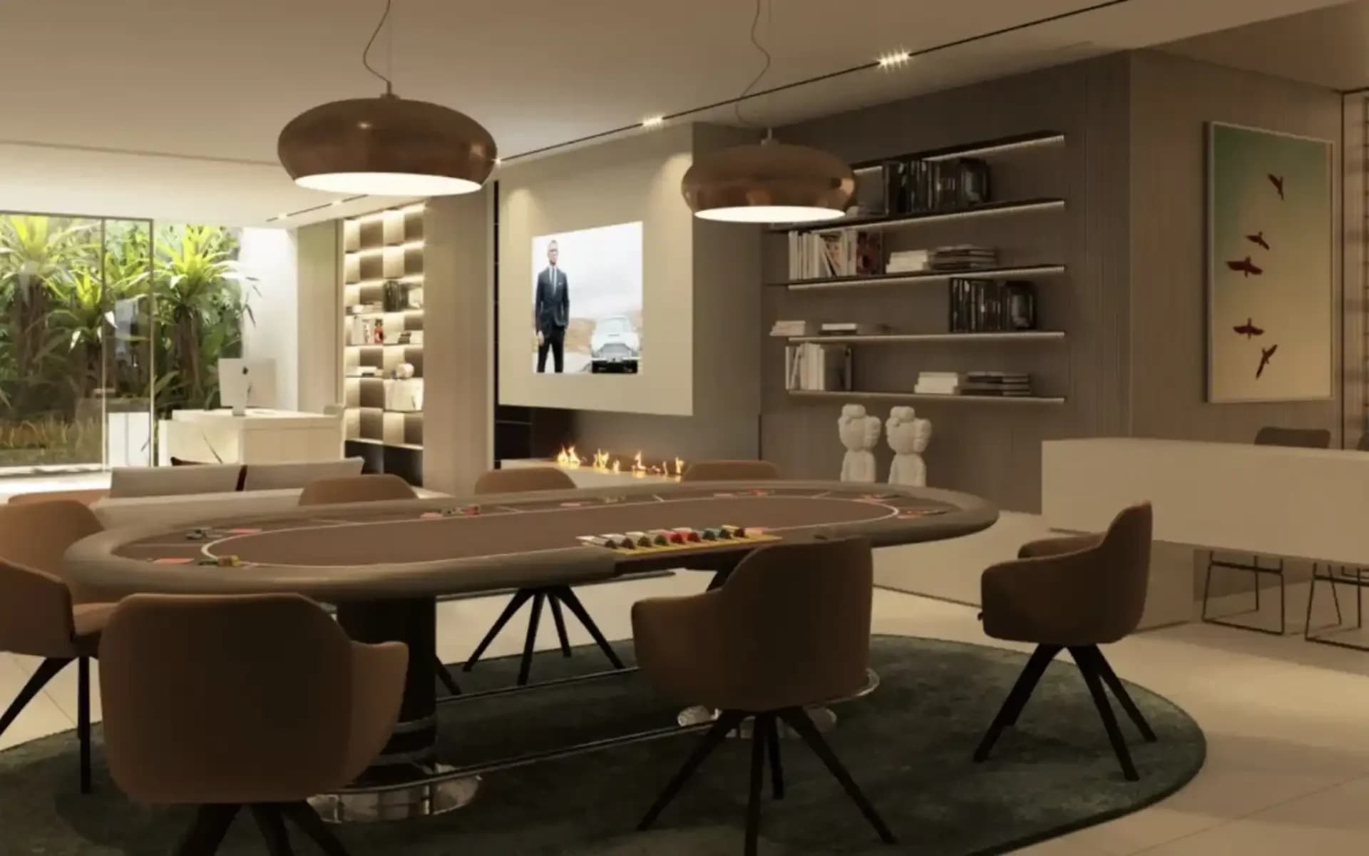 The lower level is suited to entertaining with a game room, media lounge, and cocktail bar, and features a gym, sauna, and office.