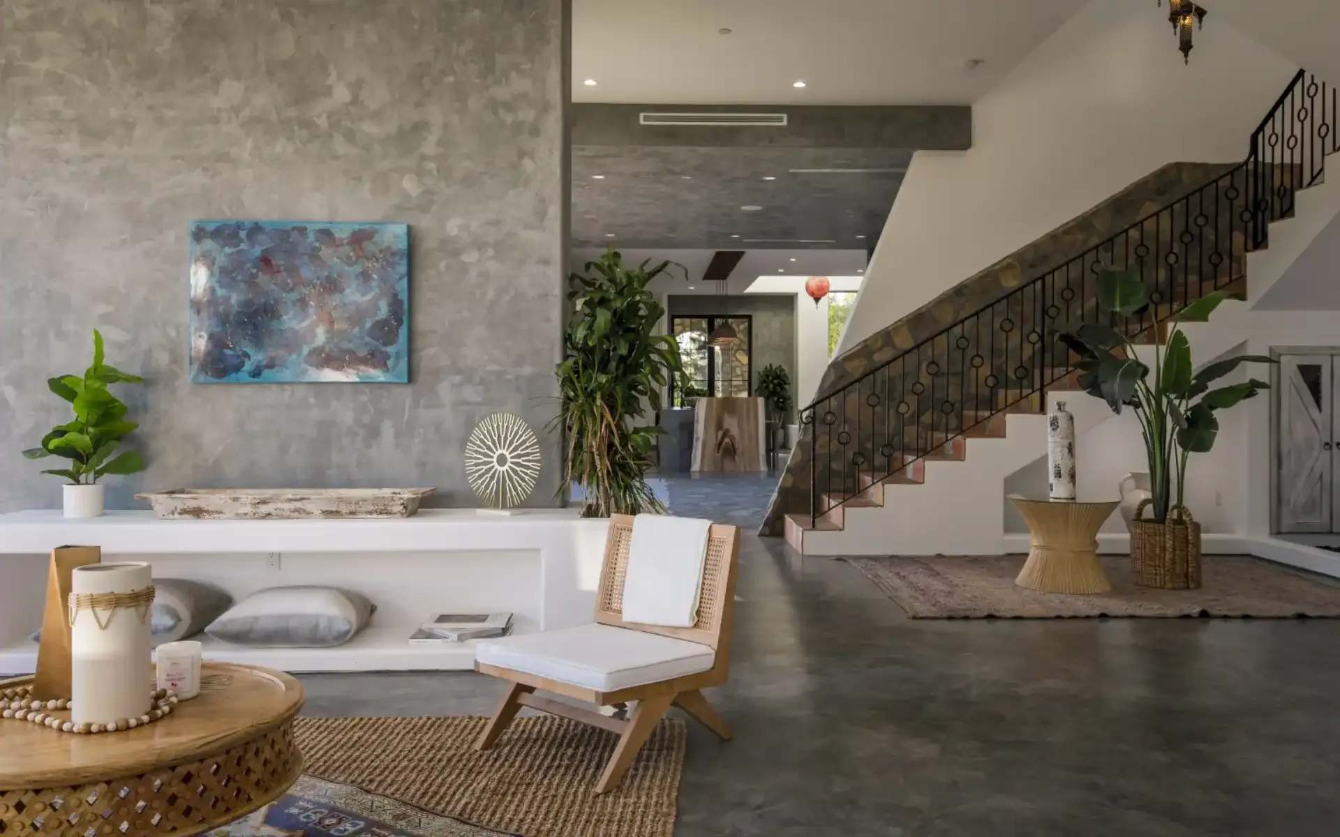 The interiors are accoutered in a bold mix of textures and colors. The focal point of the chef’s kitchen is a rustic rock wall. The beautiful finishes continue in the vast center island with a live-edge maple countertop. The dining room has a long banquette and a romantic Mediterranean arcade for alfresco dining. Just beyond is an outdoor kitchen with a barbecue and built-in bar overlooking the mountains and the sea.
