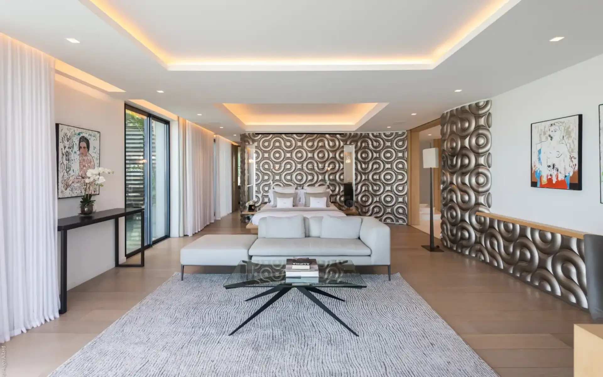 The bespoke touches and artisanal finishes begin at the hand-crafted front door, flowing to the entrance hall with its 3D Bardiglio sculpted marble curtain and Versailles-patterned lacquered wood floor.