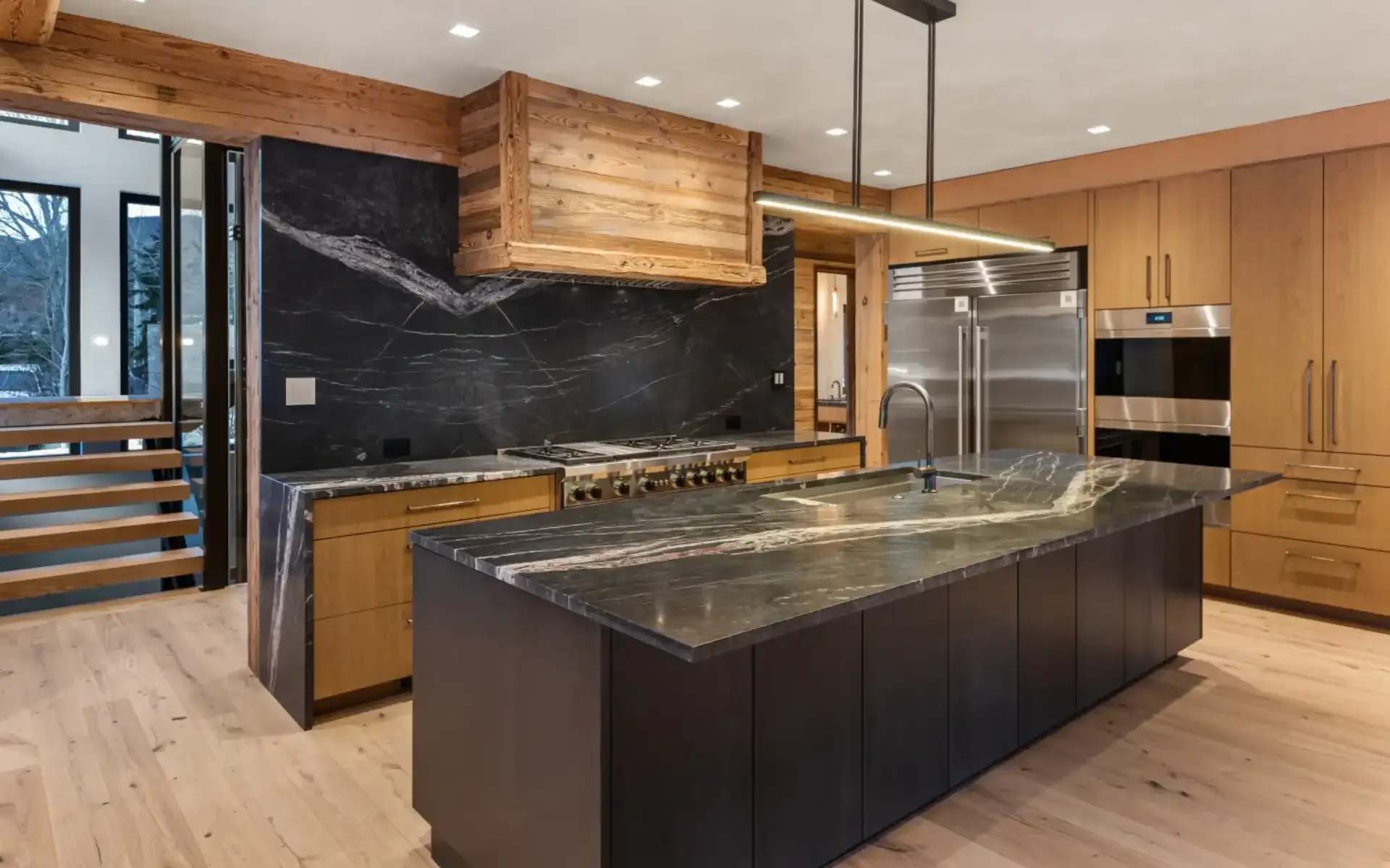 The natural elements of the exterior echo inside with old-growth timbers, wood panels, and locally fabricated architectural steel—a nod to European style and craftsmanship. Several custom-built stone fireplaces add additional warmth. Picture windows, skylights, and sliding glass doors infuse the space with fresh mountain air and frame the majesty of the Rockies.